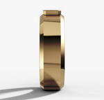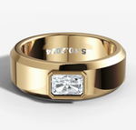 A radiant cut diamond of your choice is bezel set on top of a beveled edged flat band. A modern design that is as comforable as it is impressive.