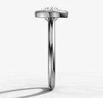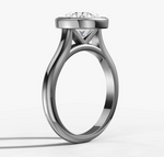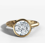 The classic bezel setting gets a modern twist on the sleek gold band. This delicate cathedral solitaire design ensures a flush fit.