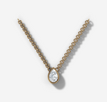 This bezel set pendant is the perfect mount to showcase the pear brilliant cut diamond of your choice. The accompanying chain is approximately 45cm with an adjustable clasp.