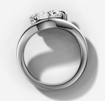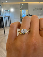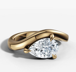 A rounded solitaire with a subtle dip. The East-to-West orientation of the pear cut centre diamond allows the shank to follow the stones shape.