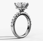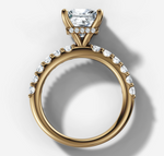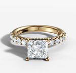 Our signature diamond band! This shared prong setting allows for maximum light exposure, enhancing the sparkle of the diamonds while maintaining a sleek and modern silhouette. The delicate hidden halo complements the elegant princess cut diamond in the centre.
