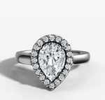Delicately crafted, this ring showcases a single row of prong set round brilliant cut diamonds that beautifully frame the pear cut centre diamond, enhancing its sparkle and brilliance.
