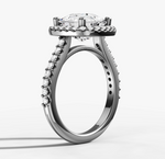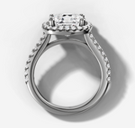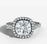 Delicately crafted, this ring showcases a single row of prong set round brilliant cut diamonds that beautifully frame the cushion cut centre diamond, enhancing its sparkle and brilliance. The fine prong set diamond band further enchances the design.