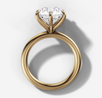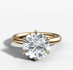Our most loved solitaire engagement ring! This prong-setting is the perfect way to show off this stunning Round Brilliant Cut Diamond shape, elevated further by the slim band. It makes the stone look like it’s floating on your hand, and the prong setting lets light shine through from every angle.