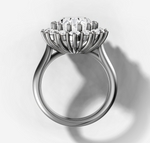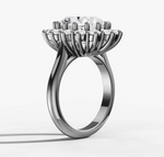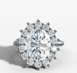 This exquisite starburst diamond halo ring features a stunning oval cut centre diamond surrounded by a halo of brilliant diamonds. The sleek, plain band beautifully accentuates the dazzling halo, enhancing the ring's elegance and making the center stone the focal point of this captivating design.
