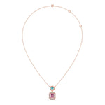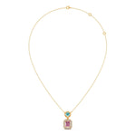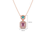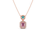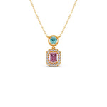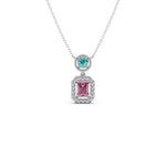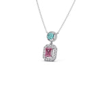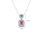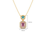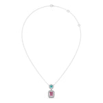 Shine bright with this Teal & Pink Gemstone Pendant Necklace from JewelVerra. The design features a round aqua-blue gemstone on top and a larger emerald-cut pink stone below, both wrapped in a beautiful diamond halo. The gold-plated finish adds a luxurious touch to this colorful and classy piece.