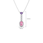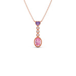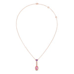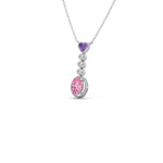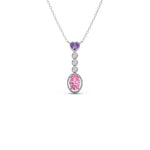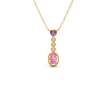 Add a pop of color to your fine jewelry collection with this Pink and Purple Gemstone Pendant Necklace. At the top sits a heart-shaped purple gemstone, followed by a vertical trail of sparkling round-cut diamonds, leading to a stunning oval-cut pink gemstone at the bottom.