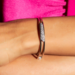 This stylish diamond bangle bracelet in white gold features a sleek double-band design with a row of shimmering marquise-cut diamonds at the center. The clean lines and contemporary elegance make it perfect for both formal and everyday wear.