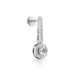 These white gold dangle earrings feature sparkling round-cut diamonds in a halo setting. With a slim drop design, they shine beautifully with every movement. A perfect choice for elegant events or weddings.