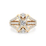 This designer diamond ring features a stunning fusion of round, pear, and baguette-cut diamonds. With a luxurious split band and intricate detailing, this ring is crafted in radiant yellow gold to create a powerful visual impact. Perfect for women who love bold, artistic elegance with a high-fashion twist.