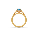 This eye-catching yellow gold ring features a vibrant blue oval gemstone, surrounded by a halo of shimmering diamonds. A perfect blend of color and sparkle for elegant women.