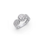 This luxurious round-cut diamond ring features a brilliant center stone surrounded by a shimmering diamond halo. The band is uniquely styled with dual designer loops encrusted in diamonds, all set in rich yellow gold. It's the perfect mix of classic shine and modern luxury for special occasions or everyday elegance.