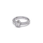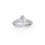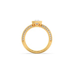 Turn heads with this stunning pear-cut diamond ring in yellow gold. Featuring a split band fully studded with round diamonds and a sleek bezel setting.
